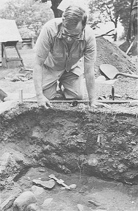 Archaeologist Bonnage viewing stones of first footer uncovered. Note axe head next to north-pointing arrow.