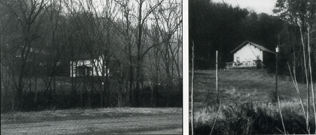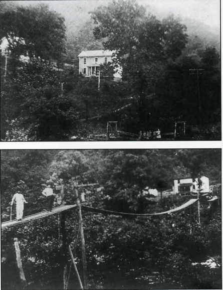 The top picture shows children crossing a trestle style bridge over Dry Run. The building obscured by trees was Rockport School. Notice the electric poles and lines running high over their heads.