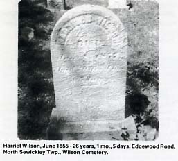 Another interesting grave is that of Thomas Moore, first settler in Hanover Township, and also a Revolutionary veteran. He was born on a farm near Leesburg, Virginia in 1750. At twenty-four years of age he was married to Rachel Phillis, a neighbor girl, and some two years later - in 1776 - settled on a tract of 500 acres lying along the present Route 30, three miles south-east of Hookstown, a portion of this land is now known as the "Pioneer Fruit Farm", and owned by ON. Boone. In the year 1777 he attained his Revolutionary veteran status by helping defend Fort Pitt; there he served a three months tour of duty under the command of Brig.-Gen. Edward Hand. Fort Pitt was then menaced by over two hundred and eighty Indians sent out by the British forces at Detroit. Meanwhile Moore's family took refuge in a block-house, probably Dillow's Fort. Thomas and Rachel Moore were the parents of five sons and three daughters, and in order to secure proper schooling for their children engaged a pioneer schoolmaster - one William Glendy - and gave him fifty acres of land as a recompense for his services. Thomas Moore died on June 2, 1821, at the age of seventy, a nd was buried at Mill Creek, by the side of his father-in-law, Joseph Phillis. This Joseph Phillis had the unique distinction of having lived in three different centuries. He was born in England in the year 1694, and as a young man served in the British navy on board a man-of-war. Sometime after leaving the English service he came to America, and settled near Leesburg, Virginia. He remained there until 1774 when he came to western Pennsylvania and located on land near Burgettstown. After the death of his wife in 1790 he came and made his home with his son-in-law. Even when well over one hundred years of age he retained his vigor of mind and body to a remarkable degree. Only after a severe illness did senility set in, and failing eyesight hamper his movements. He died in November, 1801, at the unusual age of 107, one of the oldest persons ever to live in Beaver County. The location of both his and Thomas Moore's graves has long since been lost.