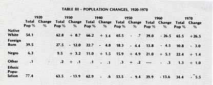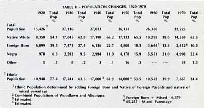 The figures in Table I (not included with this web version) shows that the ethnic population and foreign born have long been a significant percentage of the total population of the town. 1930 marks the peak of ethnic population in terms of number of foreign born and those of foreign-born parents or of mixed parentage -- the latter having at least one foreign born parent. 1920, however, marks the peak in ethnic percentage of the total population