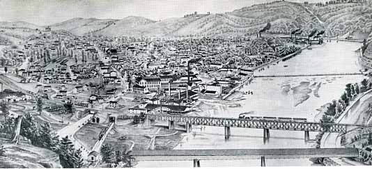 A high bluff overhangs the business part of the town, the brow of which is ornamented with many handsome dwellings, and in fact the great bulk of the people live on the bluff, the strip on the river being taken up almost completely by the railroads, railroad buildings, commission and storage houses, and the manufacturing establishments referred to above. The situation is healthy, and from the bluff the scenery is picturesque and heartsome. The borough contains at the present time some 1,300 inhabitants, and is rapidly increasing.