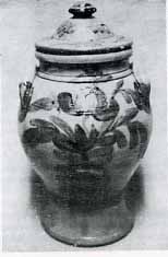 One such craftsman was John Weaver. He was first recorded as owning property in Brighton Township in 1855. The Weaver Pottery is shown on a 1869 map of Ohio River towns, on the west side of Mudlick Creek. The ware made by the Weaver pottery was some of the finest produced in Beaver County. The clay body was a bright grey and gave a perfect background for the application of cobalt slip in the typical flower design. Infrequently, unusual forms of trees and other whimsical displays such as a jug with freehand printing "OLD RYE" to herald its contents,do surface and are highly prized. These decorated containers were produced in the standard utilitarian forms previously mentioned. The Weaver pottery had one of the longest production records in the county, somewhere around forty years. George Weaver, worked with his father at the pottery. As of this writing, the only trademark known for the Weaver Pottery is an impressed J. Weaver, usually brushed with blue.