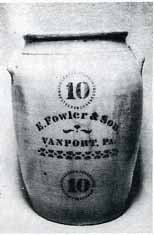 Sometime in the middle 1850's an Irish born potter by the name of Encoh Fowler settled in the town of Vanport and started probably the largest pottery firm in the Beaver area on Beaver Road. The early products of this firm were embellished with elaborate freehand decorations and impressed with the mark, E. Fowler Beaver Pa. Later examples are stenciled E. Fowler and Sons, Vanport Pa. The Fowler pottery is probably the most widely known of the Beaver or Vanport Potteries. Enoch, Jefferson, and Stewart Fowler are all listed as potters in the 1876 Business directory and advertisements from this period state that stoneware of superior quality can be secured both in person and by mail from his establishment. Jefferson Fowler was still producing stoneware according to the 1900 Beaver County census.