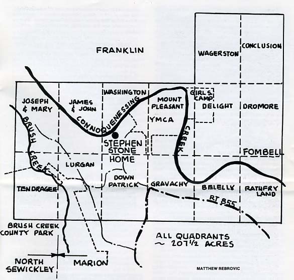 Sherlock (1806-1883) returned to Marion Twp. where he had inherited Tract 172 ("Lurgan") from his father and where he is buried across the road from the old Revolutionary War cemetery, on the last of the Stone property in the area. Sherlock had sold 140 acres of the north and east to William D. Smith, M.D. and Jaber H. Boots in 1875 and another 16 acres west of Brush Creek to Boyd Mercer in 1880, retaining about 52 acres, which he left to his sister, Catherine Smith, when he died in 1883. That land remained in the Stone family until 1941 when it was sold to Moss Laudebaugh and Sarah Katherine Lauderbaugh. It was sold to John H. Emerik, Jr. in 1962.
