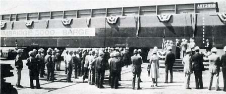 Festooned with red, white and blue bunting and flying an American flag, the 293-ton barge was christened with the traditional bottle of champagne before it descended the ways into the river. The huge water freight carrier can transport about 1,667 tons of dry cargo and measures 35 feet by 200 feet with a 12-foot depth of hull.