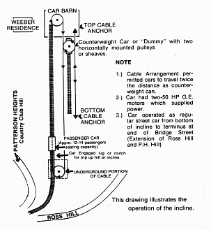 The Patterson Heights Street Railway, better known as the "incline" was built by John Reeves, an early resident, who, it has been said, received inspiration for its operation through observation of mining equipment during travels in the western part of the United States.