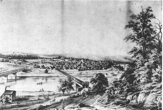 The painting is a landscape showing the falls, an old mill and the surrounding country covered with trees. The artist was secured to paint the picture as the land then appeared and it was the intention of the founders of the proposed city to have a picture painted in later years showing the vast change they anticipated. The party, which consisted of Horace Greeley and General Hiram Walbridge, of New York, Marcus T.C. Gould and John Thompson, of Rhode Island; Stephen DeLay and Judge Robinson, of Boston, and a number of other Eastern as well as some Pittsburg capitalists met in the office of John L. Newbold, in the fall of 1853, and while a number agreed to invest $70,000 each, the others subscribed sufficient to make $800,000 to develop the rival of Pittsburg.