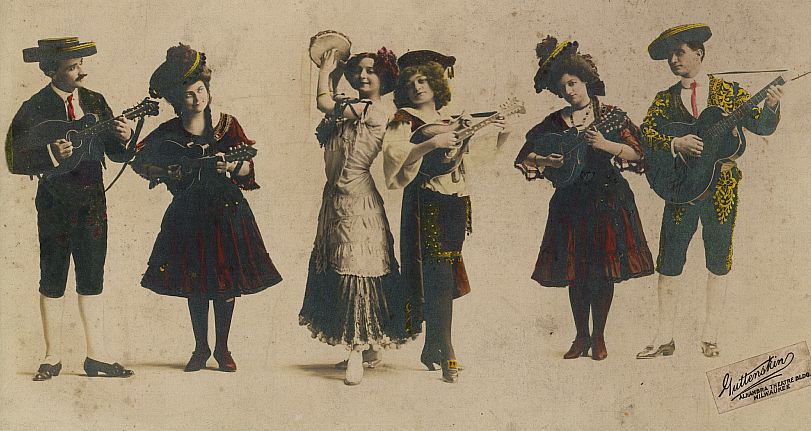 The Six Musical Nosses "in Old Seville," appear in a beautiful Spanish setting, with dreamy lights, while a dashing little diavolo, in Carmencita trappings whirls and supples to the tink-a-ting of mandolins and guitars.