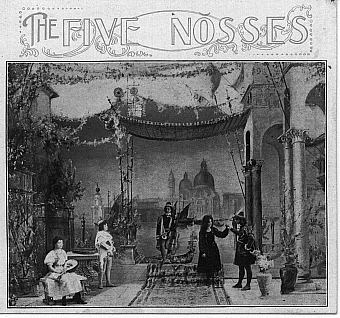 The act of the Five Nosses is one of the prettiest stage pictures ever seen here. It is entitled "A Night in Venice," and the setting is a section of the Grand Canal' Venice. The quintette make their entrance in a gondola, attired in picturesque costumes of the fifteenth century, and they give a good musical performance from start to finish. This act is totally unlike any other musical turn, but is just such a novelty as one would expect to find at Keith's.-Philadelphia Item.