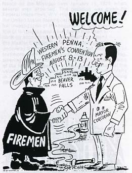 At the final business meeting William D. Lewis of Masontown was elected President of the association and Edward Closson of New Kensington elected Secretary. The secretary's position is the only paid position. At the meeting August 9th, Senator Duff was voted honorary member of the Western Pennsylvania Firemen's Association. Others voted in were Congressman Frank Clark and Beaver Falls Mayor Edward Corcoran. items on the programs were battles of the barrel, held at the 11th Street school grounds, free bingo for the Ladies Auxiliary held in the fire station. Auxiliary lunch and old timers banquet were held at the firemen's building on Bridge Street.