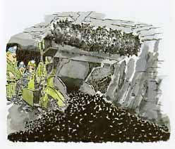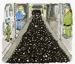 The loose coal is carried to the rear of the continuous miner and loaded into small electrically powered shuttle cars (not shown). Each car can carry about eight tons of coal. In turn, the shuttle cars bring the coal to a train of rail cars or to a long conveyor belt (above) that moves the coal to the surface.