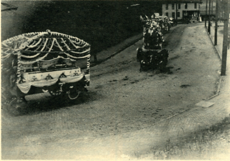 The older photograph shown was taken around 1900 by Henry Noss Fisher and was included in Beaver County Album H (#1533) by Arnold B. McMahon. This photograph is of particular interest as it shows a "parade of wagons and puffing horses coming up the hill out of Bridgewater." The straight section of track is same as shown in the current photograph. The old photograph noted the bathtub display on the first wagon.