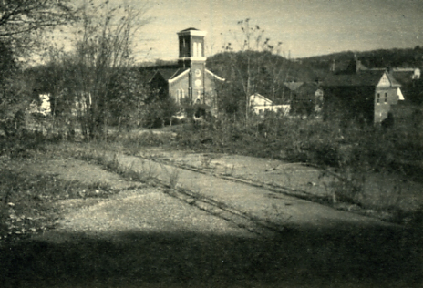 The First Presbyterian Church of West Bridgewater is shown in the center background. The four-lane Route 51 now separates the dead end Bridge Street between the church and the abandoned section. The current main access to Beaver is just to the right of the picture from West Bridgewater and Rochester.