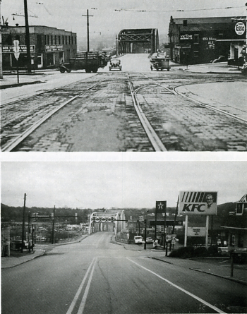 Conway's Corner in Rochester has changed quite a bit in 60 years. The top picture, at right, shows the intersection in the early 1940's. The rough pavement on Madison Street (foreground) was endured by drivers for many years. The bottom picture shows better pavement, no trolley tracks, and new businesses at the corner.