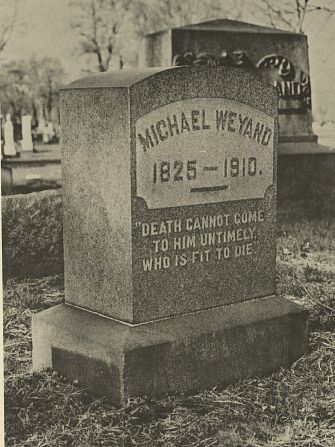 In addition to his fame as a newspaper owner and editor, Michael was also very active in Republican politics, holding the office of Prothonotary for six and a half years and serving as Presidential Elector in 1884. Michael Weyand died in 1910. See cemetery sketch for location of his grave site.