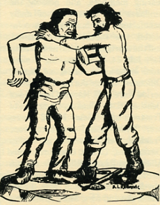 The second failure enraged Big Foot and he used both hands and feet in pitching Andrew off. Andrew picked up Big Foot's gun and shot the minor chief through the belt. Then Andrew and Big Foot went into a regular pioneer battle, Big Foot striking awkwardly over hand while Andrew struck under handed. Finding his strokes telling on Big Foot he caught him by the breech cloth, tripped him and pitched him into the river, and they were soon in deep water. Andrew caught him by the scalp lock and put his head under water and thought him drowned but when he let go Big Foot popped up like a cork and started for shore. Andrew knew Big Foot would shoot him as soon as he got his gun, so he swam out into the river and hollered for Adam.