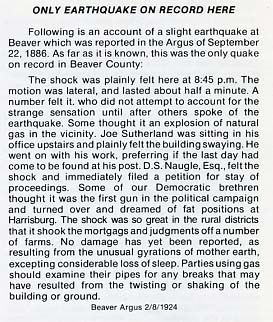 Following is an account of a slight earthquake at Beaver which was reported in the Argus of September 22, 1886.